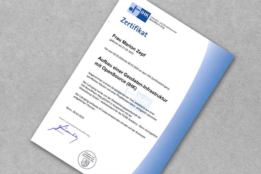 Wir gratulieren unserer Mitarbeiterin Dipl.-Ing. (FH) Marion Zepf zum Erhalt des Zertifikats „Aufbau einer Geodaten-Infrastruktur (GDI) mit Open-Source (IHK)“